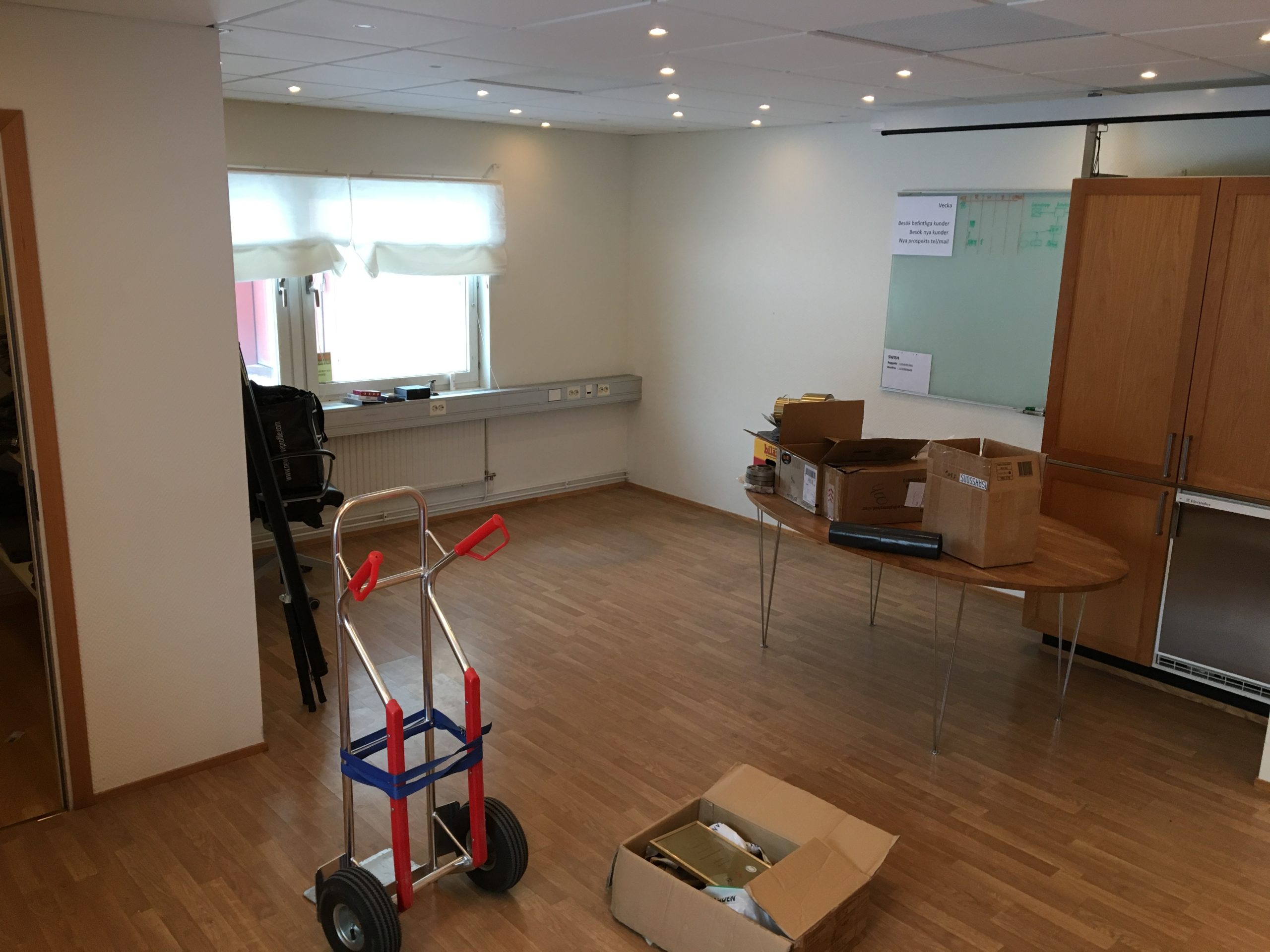 Iden vi har är två luftiga kontor med avskärmade med glaspartier. sedan en konferensdel med modernteknik och ljus atmosfär.