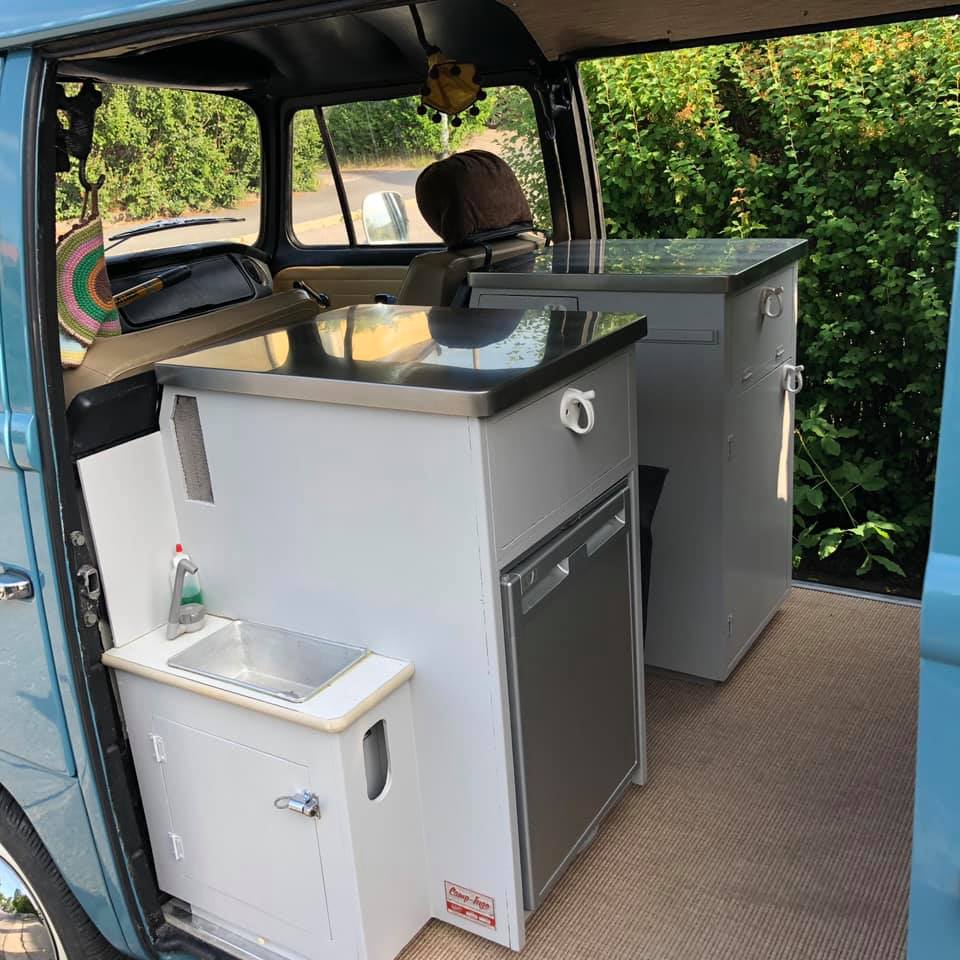 Charmiga uppdrag tycker vi är skoj! Vi fick dessa bilder från vår kund som renoverat inredningen i sin campingutrustade VW buss. Önskan var att få något mer genuint än vanliga toppskivor. Valet föll på rostfritt, passar perfekt smutt och stilfullt .