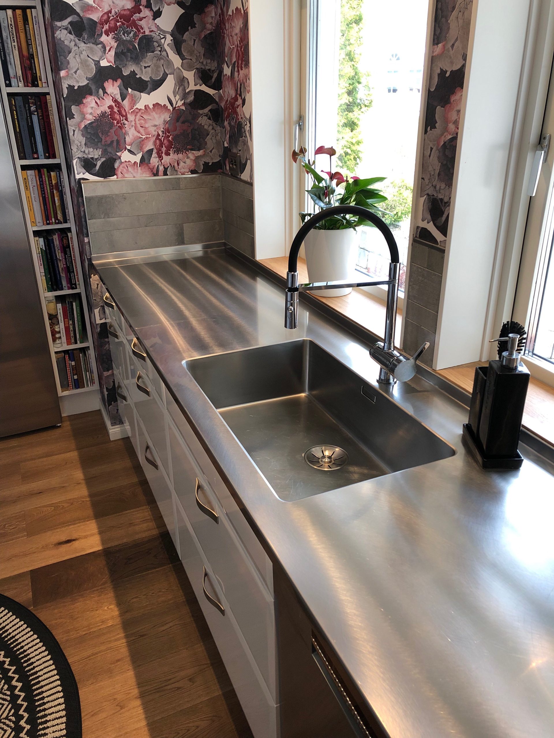 Dessa två skräddarsydda diskbänkar sitter i ett kök hos en familj utanför Mora. Bänkarna har kanten Isakssons Rak och uppvikt bakkant.